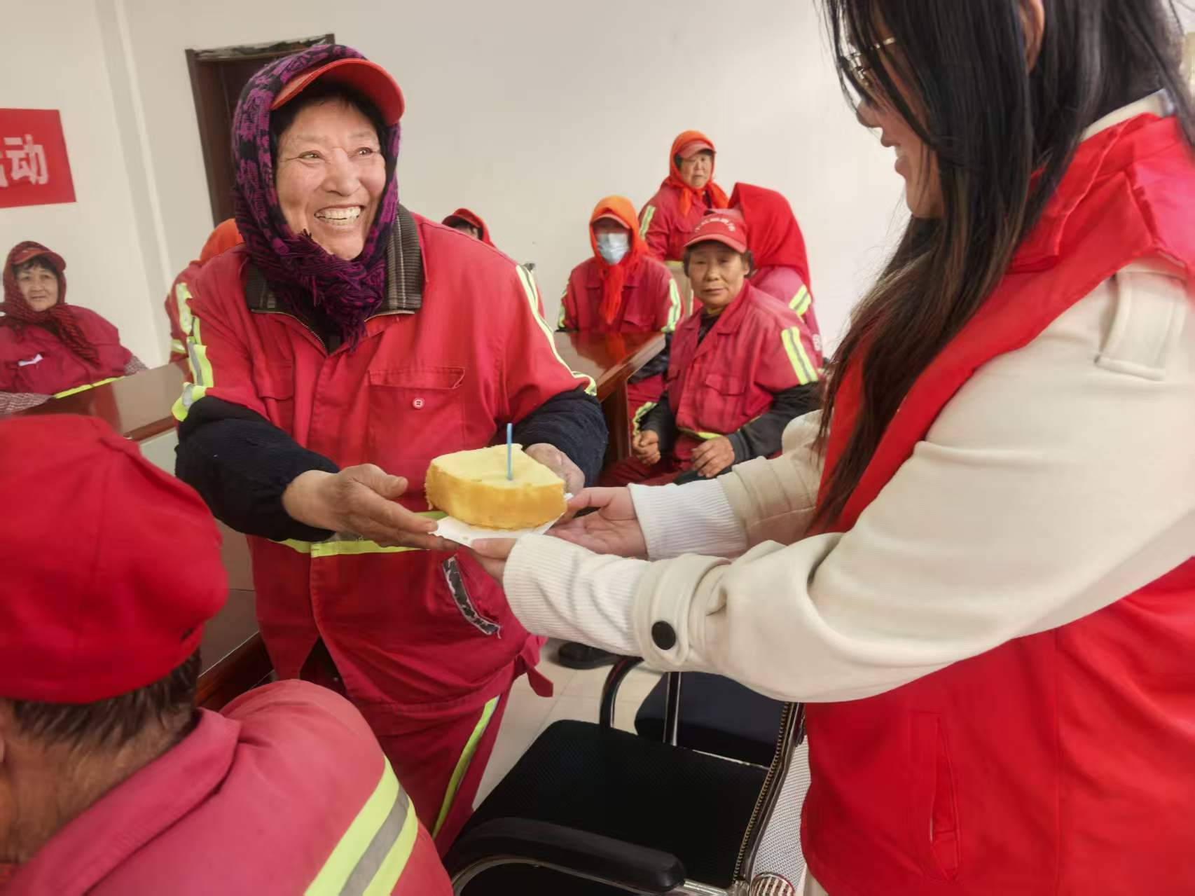 活动现场,志愿者们将新鲜制作的蛋糕逐一送到环卫工人手中,一声声“您辛苦了”的真挚问候,让常年奋战在保洁一线的环卫工人们倍感温暖,脸上洋溢起朴实的笑容。大家亲切交谈,志愿者们认真聆听环卫工人的工作日常与辛劳付出,深切体会城市美容师坚守岗位、默默奉献的精神。