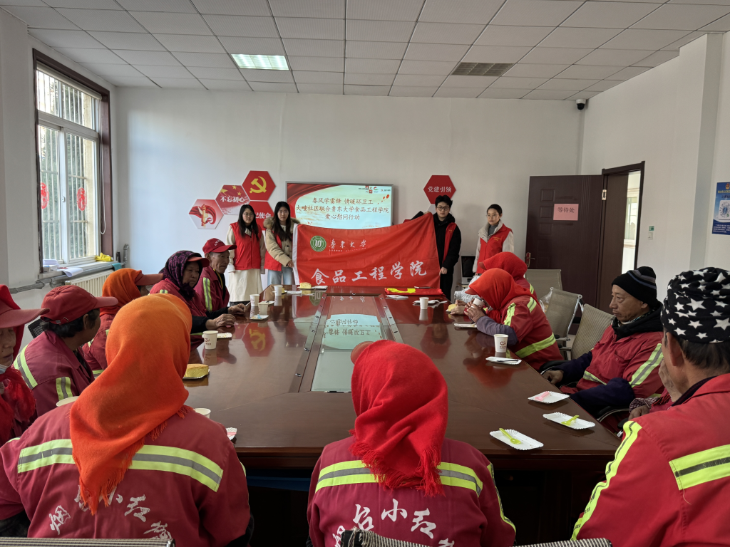 为深入弘扬雷锋精神,践行志愿服务理念,强化青年学子社会责任感,3月19日,食品工程学院组织志愿者前往烟台市大疃社区,开展“学雷锋 送温暖”主题志愿服务活动,为坚守一线的环卫工人送上专属关怀与暖心慰问,致敬平凡岗位上的奉献者。