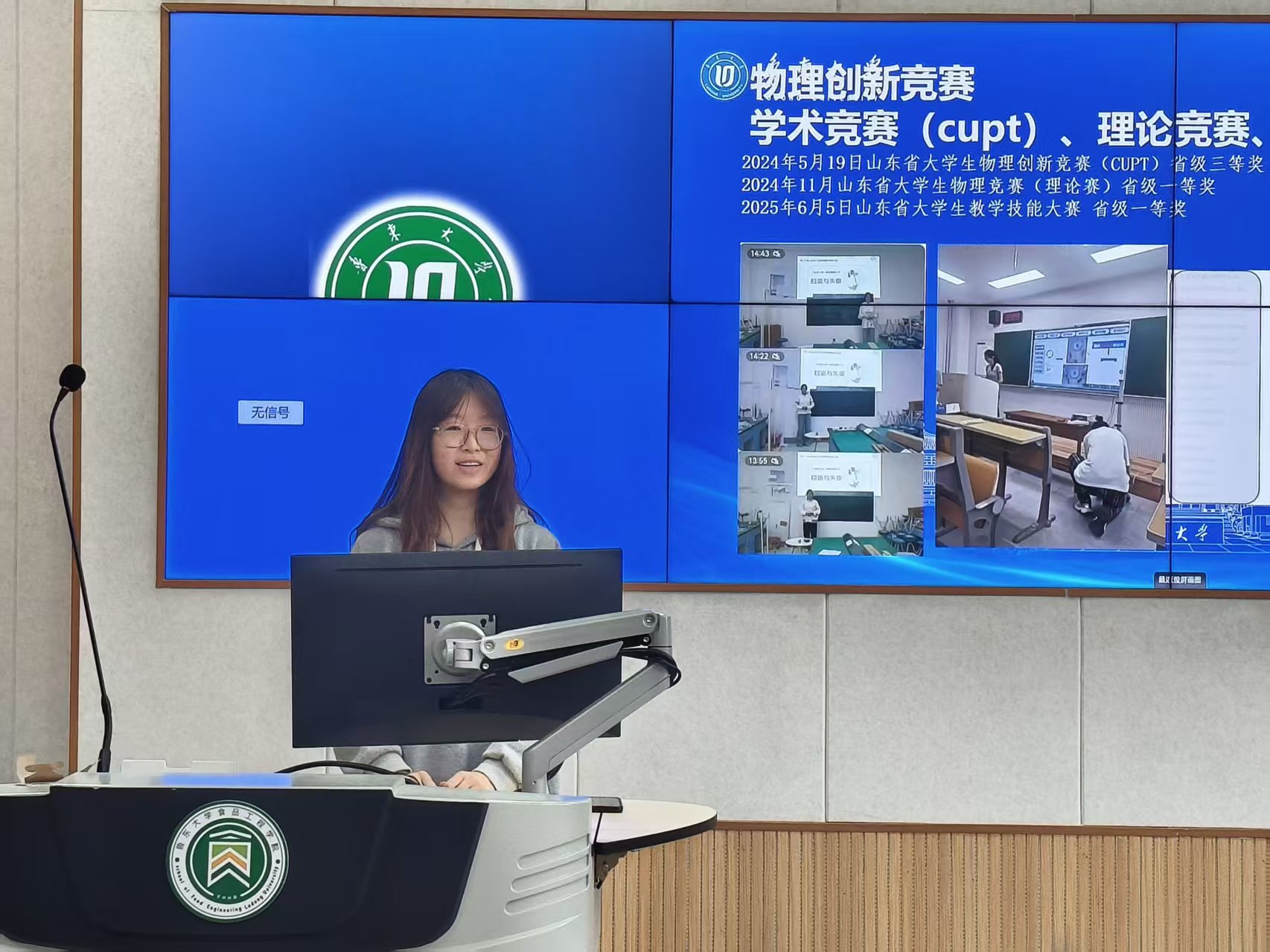 随后,物理与光电工程学院陈佳琪围绕“竞赛+科研”双赛道分享成长经历:作为“竞赛达人”,她累计参与5大类别赛事,斩获国家级、省级奖项10余项,在全国大学生金相技能大赛展现扎实实操能力,在“挑战杯”山东省大学生课外学术科技作品竞赛中带领团队攻坚,尽显团队协作与科研转化能力;科研方面,她以第一作者、共同一作身份在SCI二区、一区TOP期刊发表论文,1项国家发明专利已受理,另有1篇中科院一区TOP期刊论文待发表,学术水平广受认可。