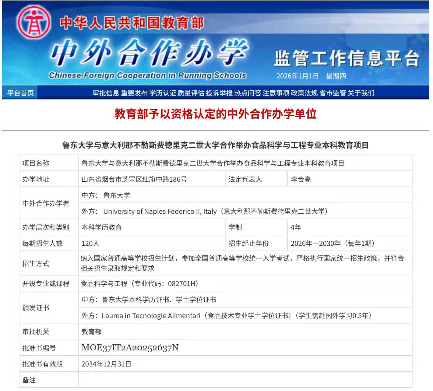 学院以立德树人为根本任务,以工程教育认证为抓手,推动教学质量与育人成效双提升。2025年12月教育部正式批准我校与意大利那不勒斯费德里克二世大学合作举办食品科学与工程专业本科教育项目,项目每年招收120人,总办学规模480人,采用双注册、双授予学位办学模式;《食品营养学》获批国家级线上线下混合式一流课程,《食品营养学》《水产食品学》2门智慧课程建成并上线;牵头申报“预制食品与营养健康现代产业学院”,推动专业与标准化教育深度融合,申报相关融合试点1项,搭建产教融合育人平台;以赛促教氛围浓厚,教师在各级教学竞赛中斩获佳绩:获2025年度山东省高校教师教学创新大赛产教融合赛道三等奖1项,首届全国智慧课程创新大赛“产教融合应用”课程赛道一等奖1项,参与获得山东省教学成果二等奖3项。以审核评估推动专业规范建设,教学材料抽查结果均为优秀;学位与研究生教育稳步推进,完成食品与营养专业硕士首次招生,从农业(食品加工与安全领域)顺利过渡,专硕一志愿报考率持续100%。